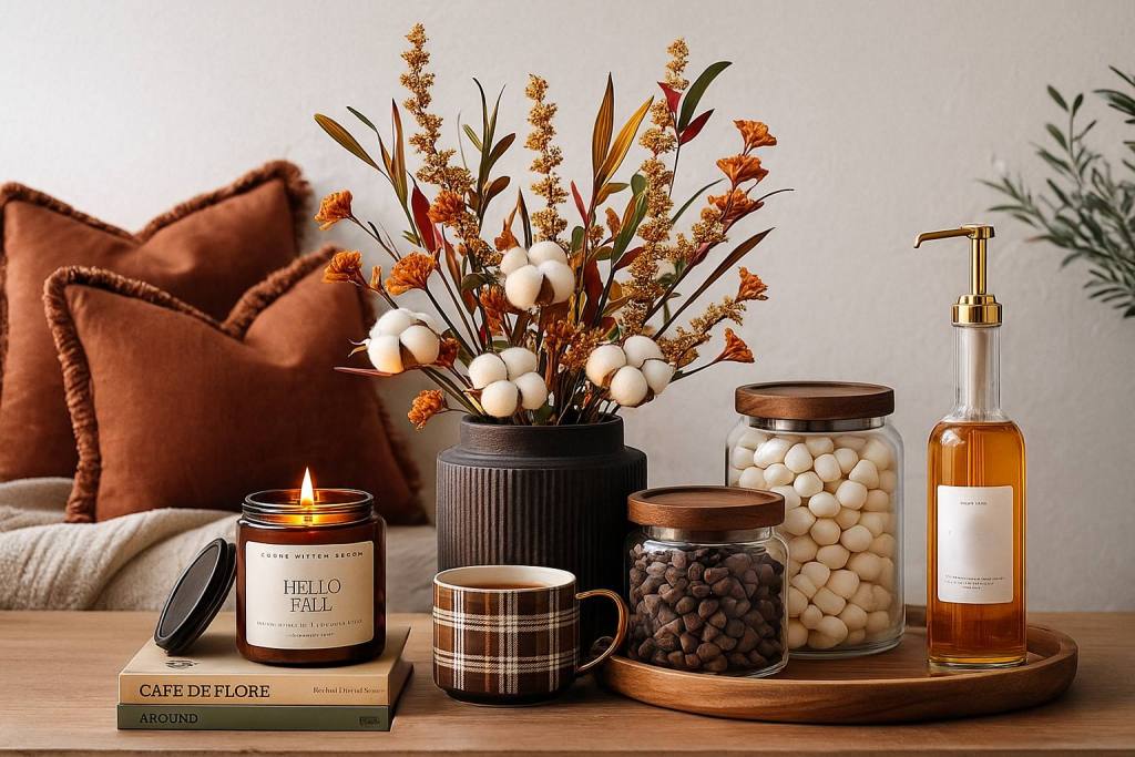 Add height and warmth with faux fall florals—they instantly soften the setup and make the whole display feel more intentional and complete. For an extra touch of charm, include a couple of small, neutral pumpkin candles to tie in the fall theme without overwhelming the space.
