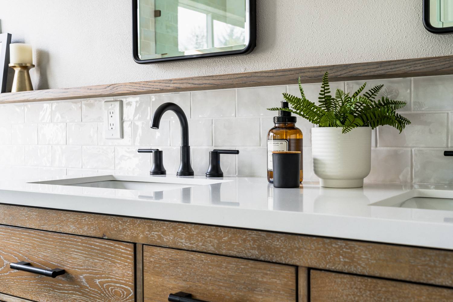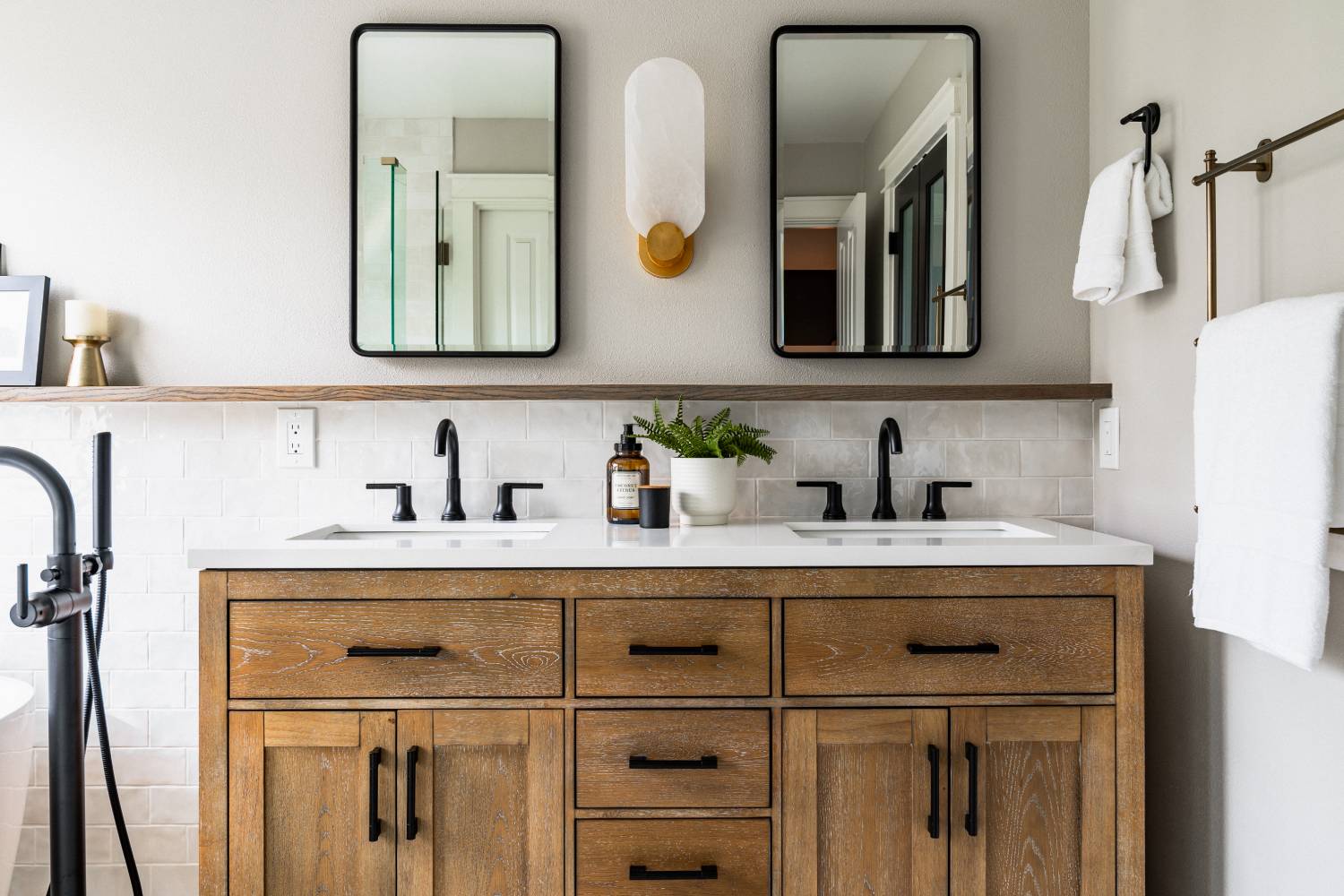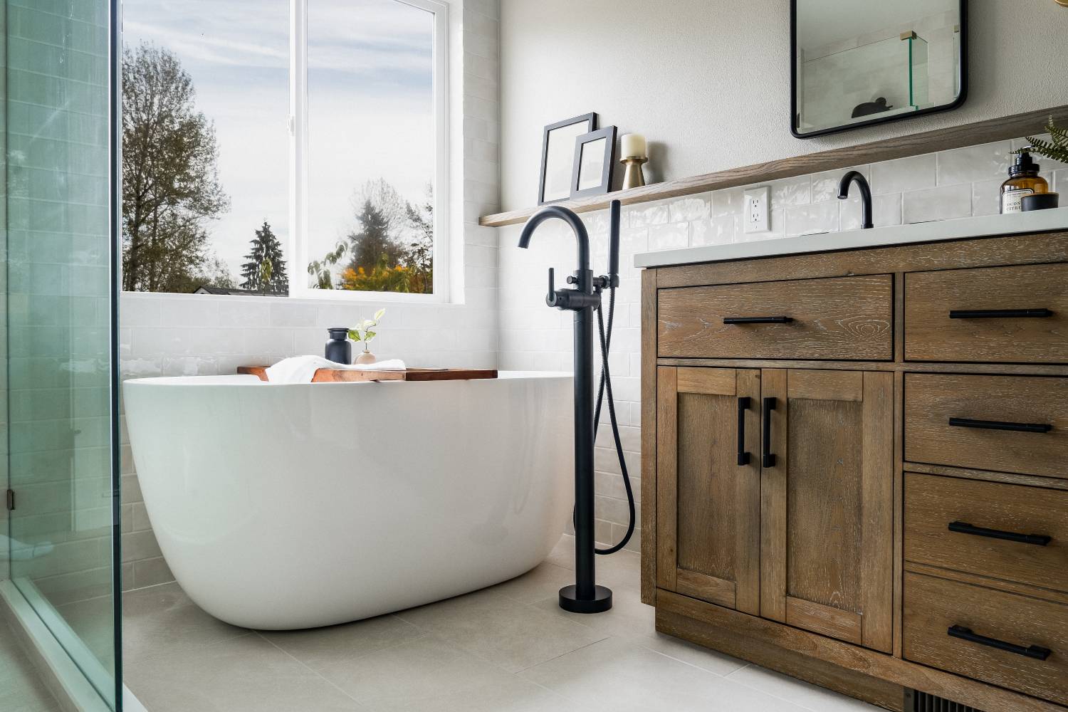 This modern farmhouse-style master bathroom showcases a bright and airy retreat grounded by bold black metal fixtures. Natural elements, like the warm wood vanity, infuse warmth and authenticity into the space. Subtle white tile walls and creamy neutral tones balance the striking contrast of the black fixtures, creating a calming atmosphere that feels both refined and relaxed. This transformation took a generic development home bathroom and turned it into a one-of-a-kind, serene master retreat that perfectly blends rustic charm with modern sophistication.