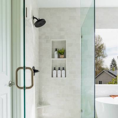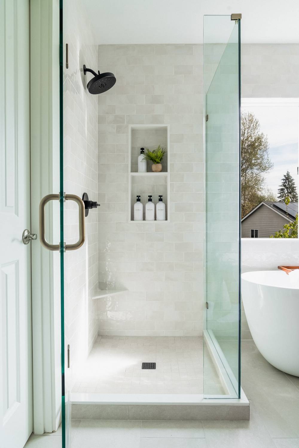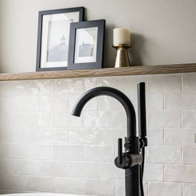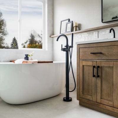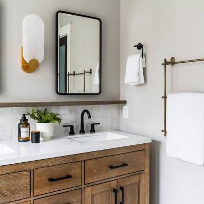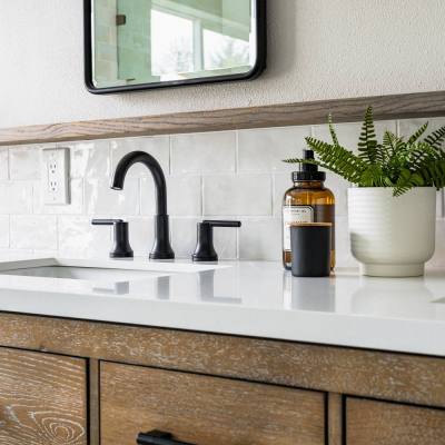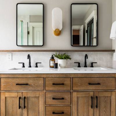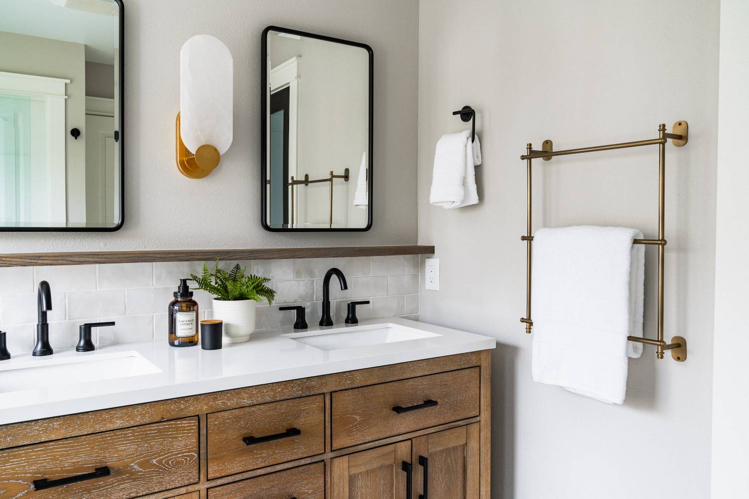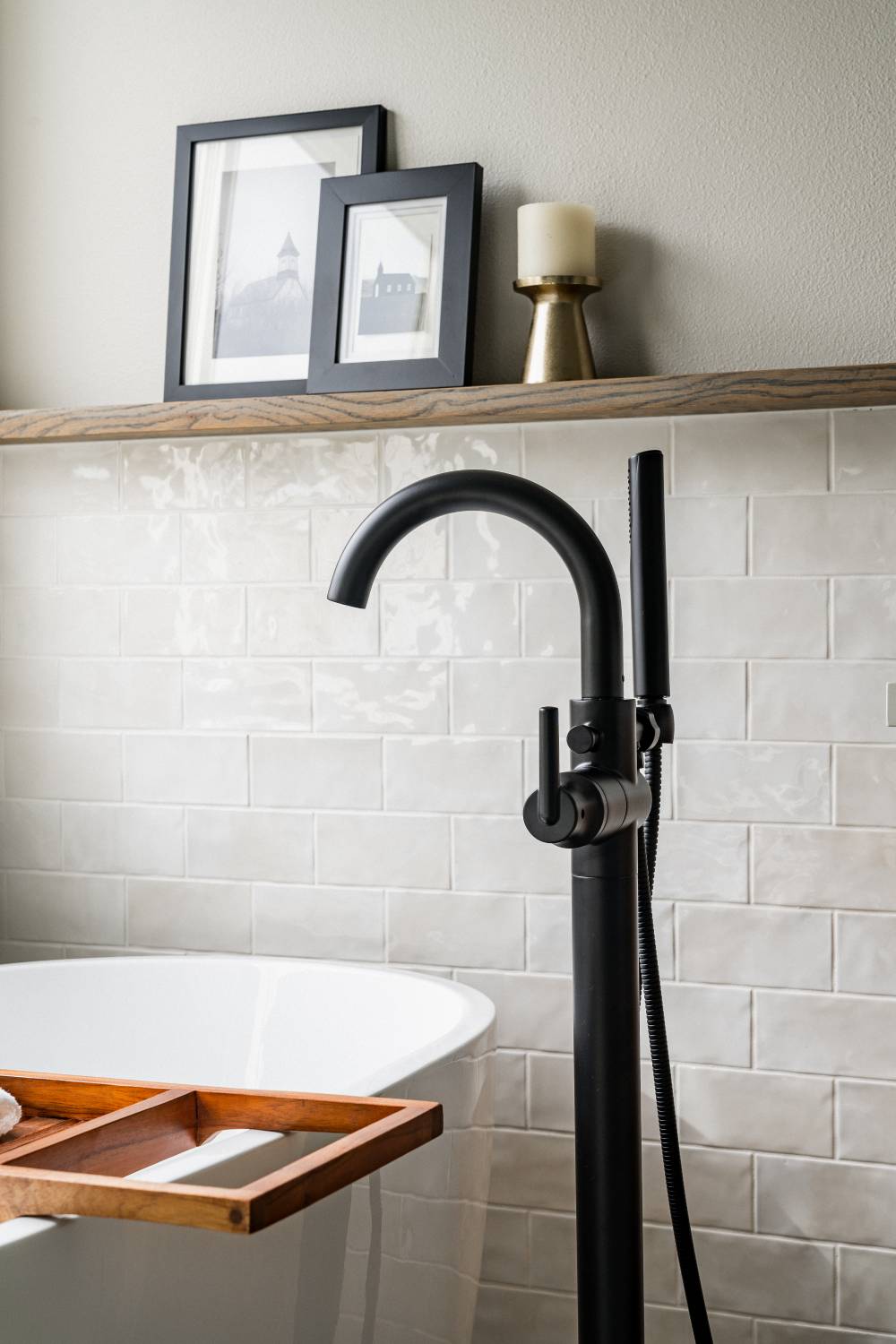 This modern farmhouse-style master bathroom showcases a bright and airy retreat grounded by bold black metal fixtures. Natural elements, like the warm wood vanity, infuse warmth and authenticity into the space. Subtle white tile walls and creamy neutral tones balance the striking contrast of the black fixtures, creating a calming atmosphere that feels both refined and relaxed. This transformation took a generic development home bathroom and turned it into a one-of-a-kind, serene master retreat that perfectly blends rustic charm with modern sophistication.